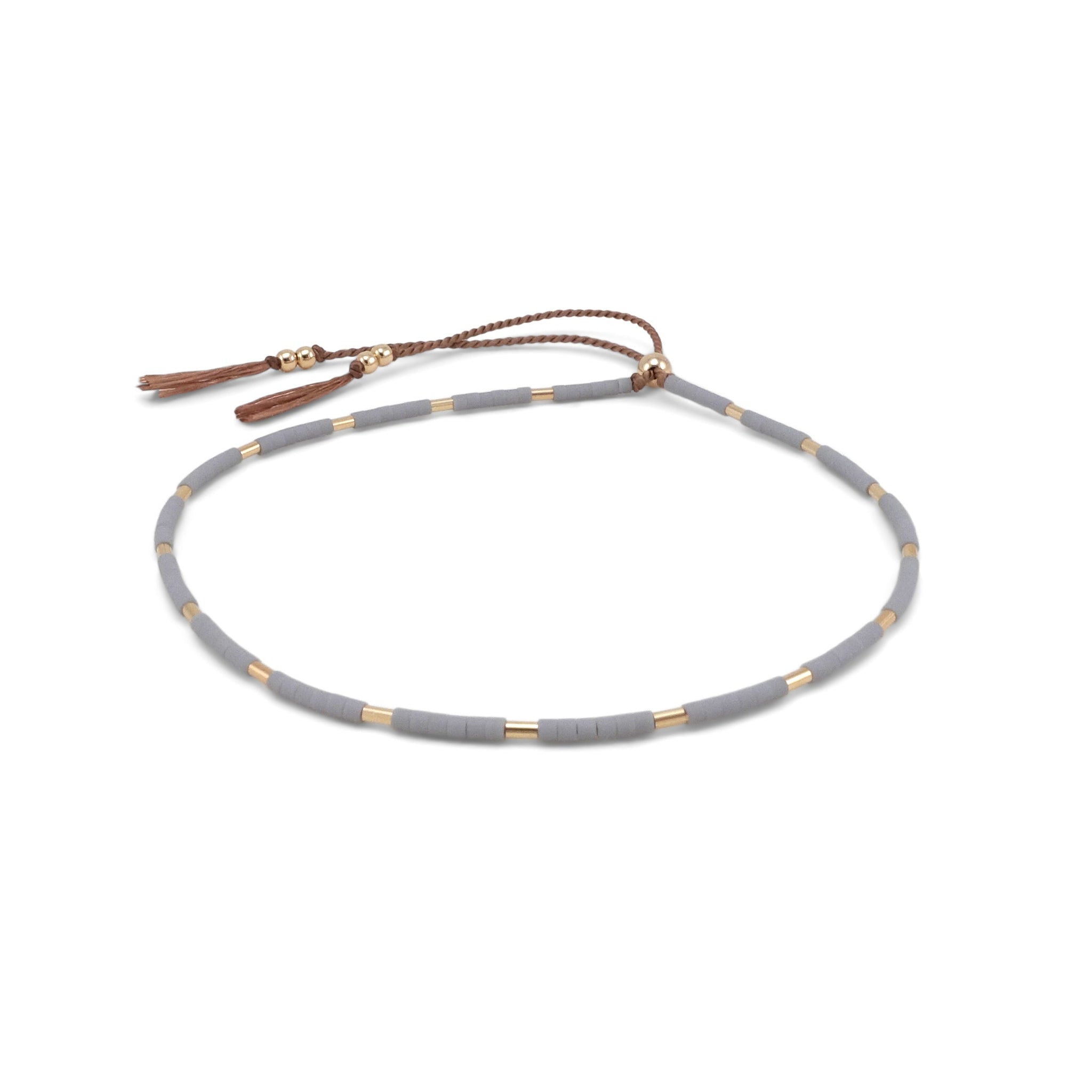 Thebe features matte glass beads in the five available collection colors evenly interspersed with delicate gold-filled beads.