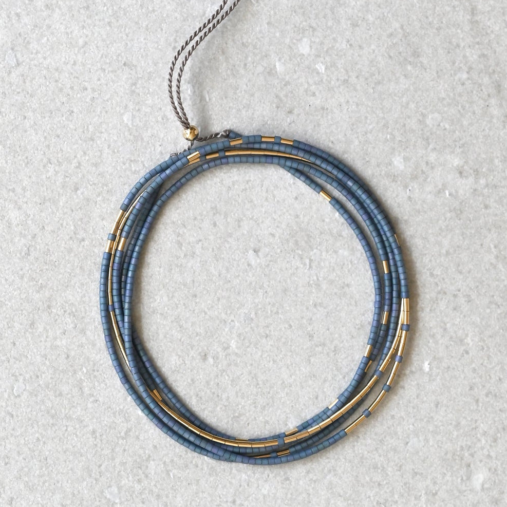 The Neso design beautifully highlights the continuity between the matte glass and gold beads that define this collection. As with all of the wraps, this piece is intended to be worn as a necklace or bracelet, and each piece is uniquely patterned so that no two are identical.