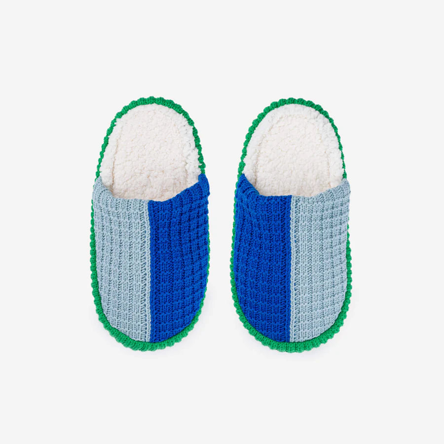 A plush, colorful take on your favorite spa-style house slippers. Backless slide slippers knit with a two-tone waffle pattern. Fully fleece-lined with slip-resistant padded soles.