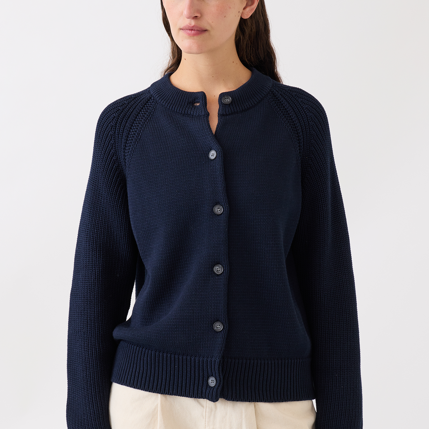Crewneck cardigan in relaxed fit. Features contrast textures - body is in jersey stitch and sleeves are in cardigan stitch.