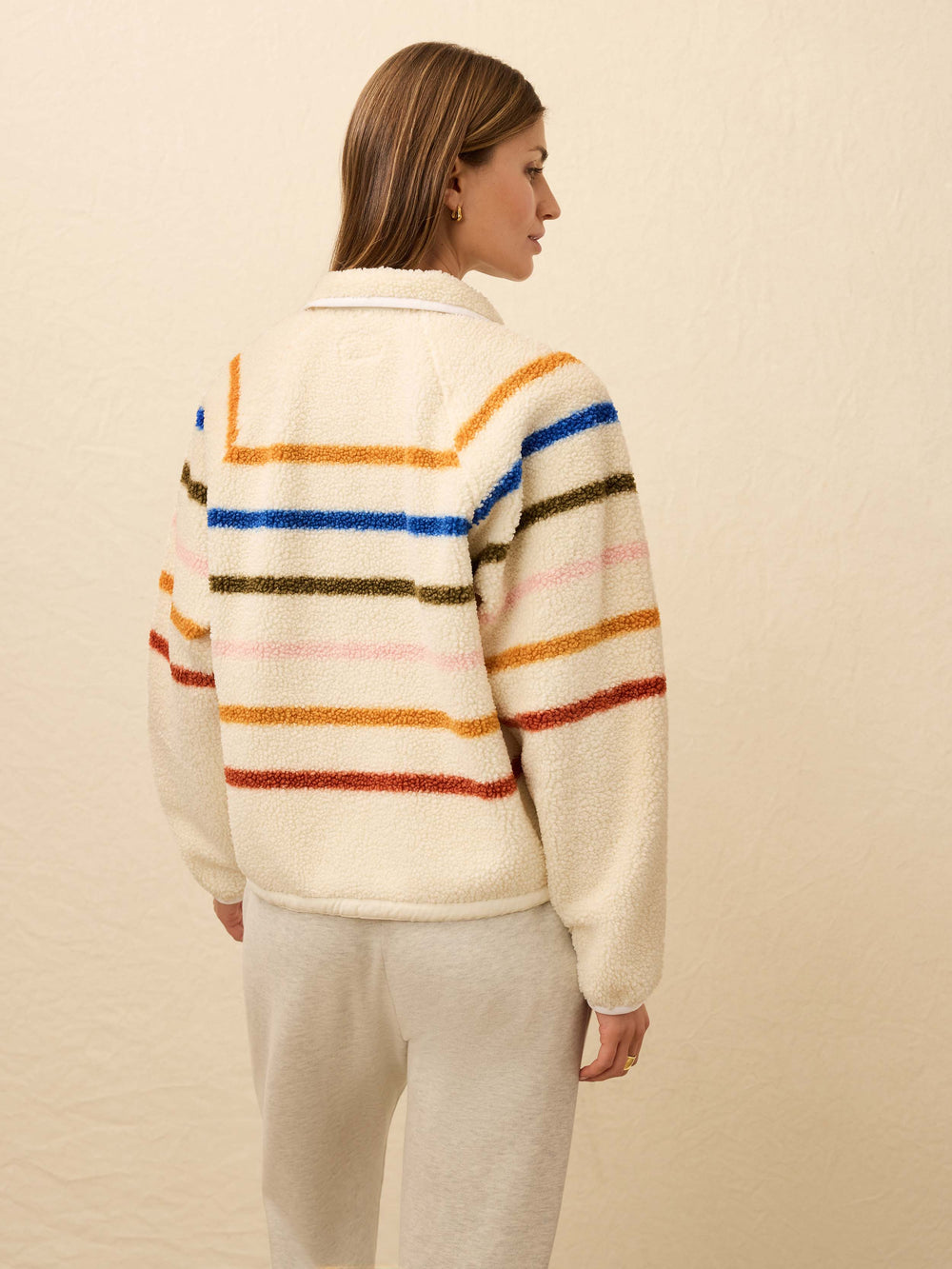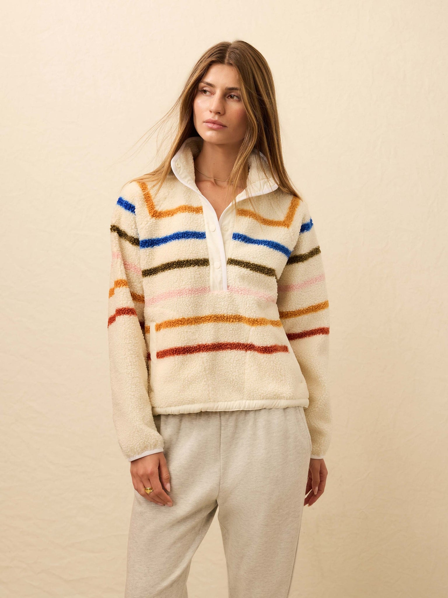 - Detail: Fleece popover with snap closure and front welt pockets.